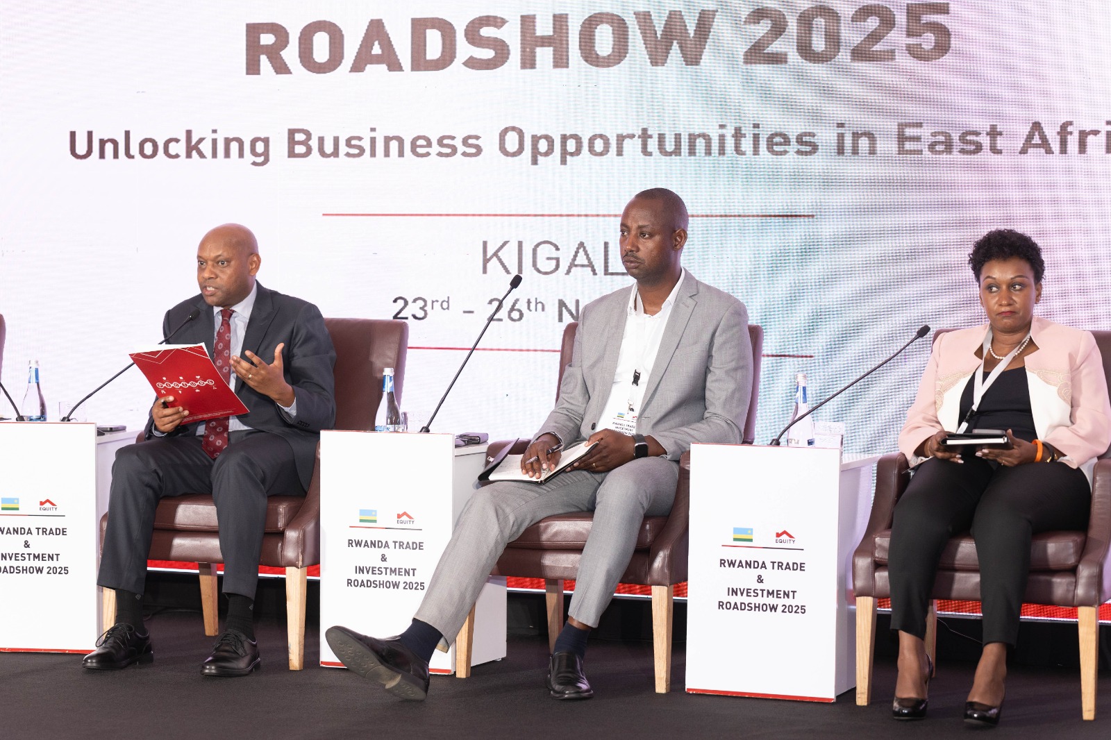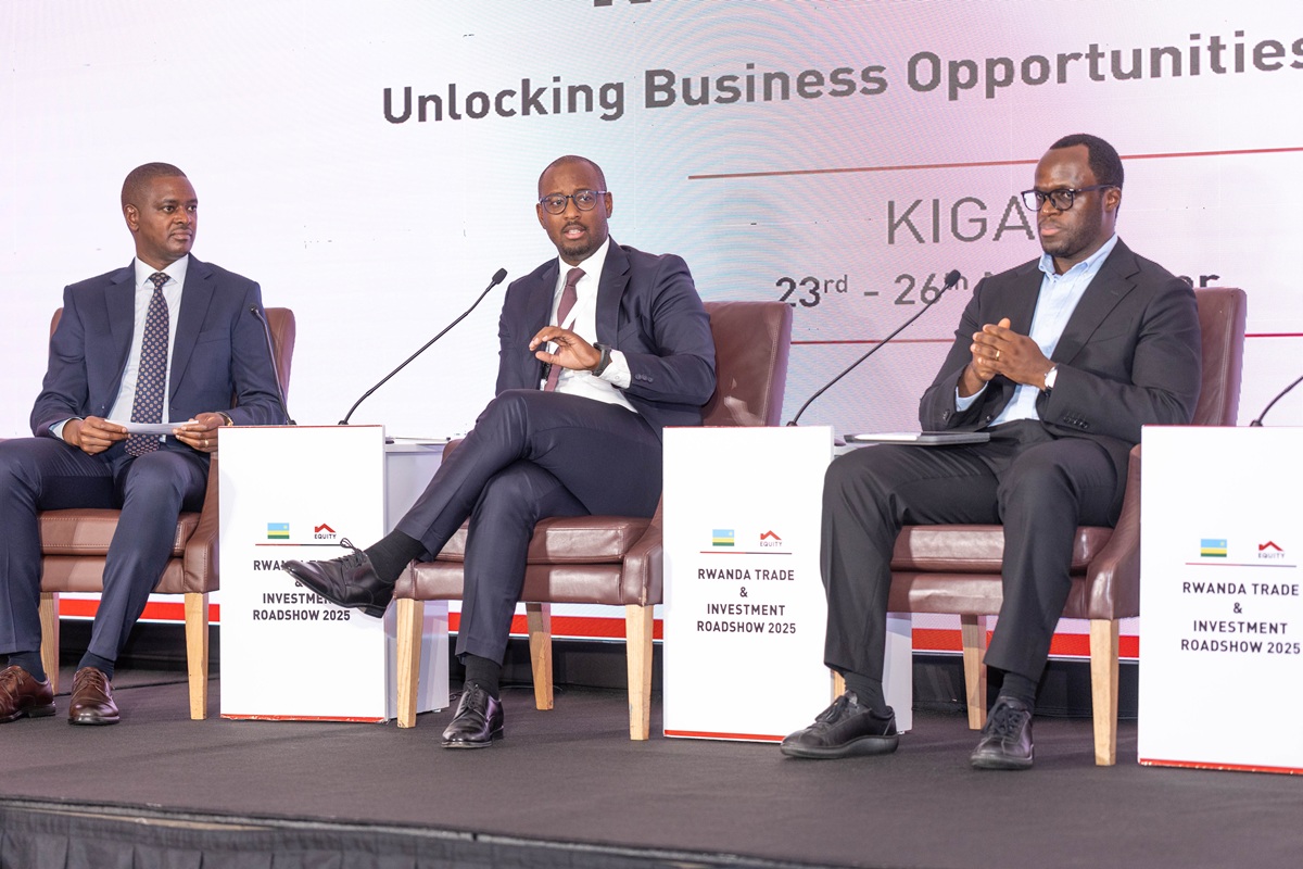 From L-R: Equity Bank Rwanda Managing Director, Hannington Namara, Inyange Industries Managing Director, Mr. James Biseruka, and DIKAM Ltd CEO, Ms. Diane Mukasahaha, during a panel discussion at the ongoing Rwanda trade mission hosted by Equity Group.